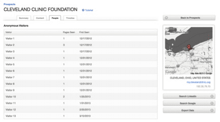 The screen shots below show an example from our website. On December 17, 2012 someone from the Cleveland Clinic Foundation visited our website at SyncShow.com. Our technologies tracked the following information.
